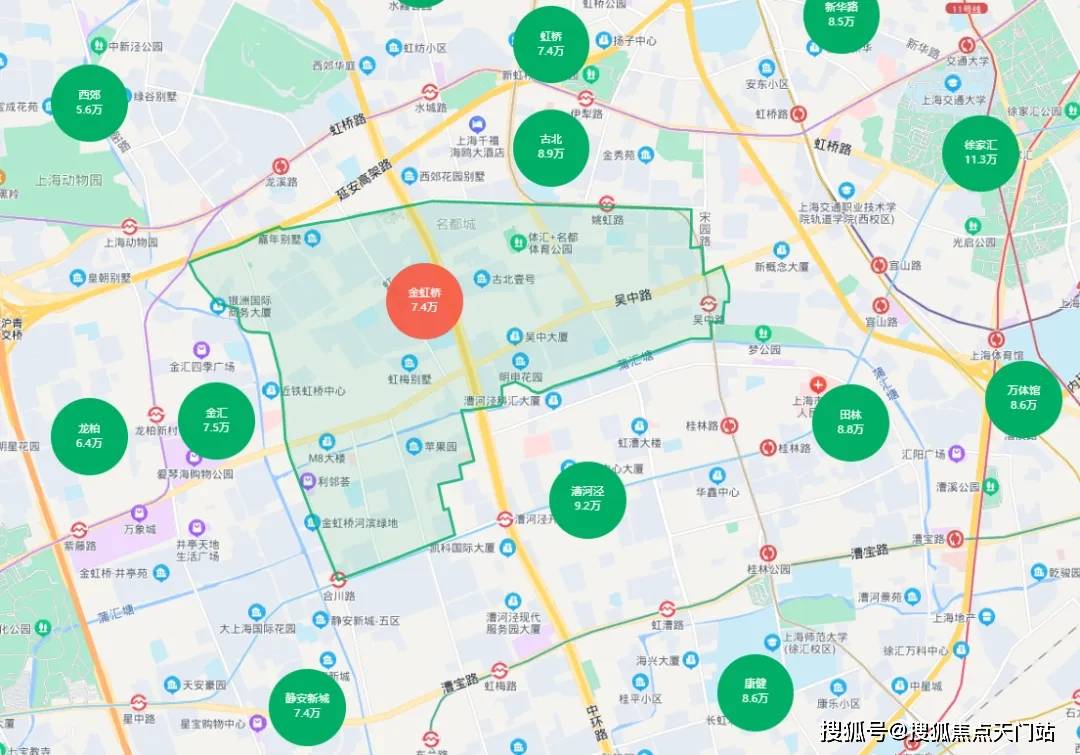 金虹桥板块,虽然归属闵行区,但它自有一层“镀金”——金虹桥板块与古北紧紧相邻,沾了古北的光,又因地理位置比闵行区其他板块相比,更贴近市中心。地处闵行、徐汇、长宁三区交汇处,被漕河泾开发区、大虹桥、徐家汇等人才聚集地包围。